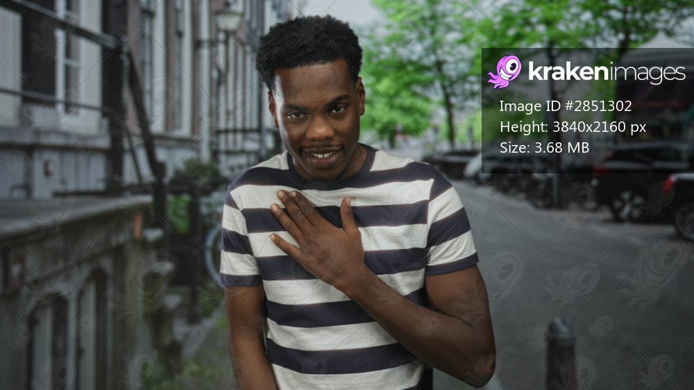 Young african american man clutch chest for heartattack on street with parked cars; pain vulnerability struggle.