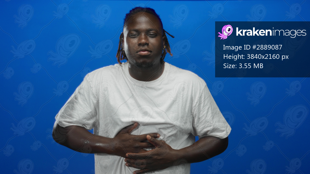 Young african american man clutching chest with both hands in a studio portrait against a vivid cobalt blue seamless backdrop; pain.
