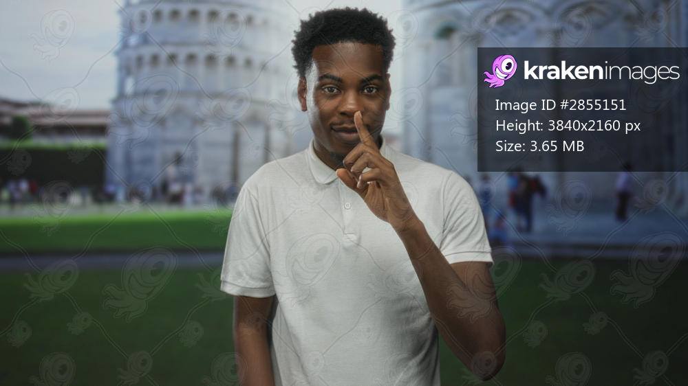 Young african american man covers mouth with hand at leaning tower of pisa building outdoors; surprise.