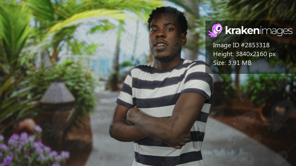 Young african american man with crossed arms stands on a forest path lined with palm foliage; confidence.