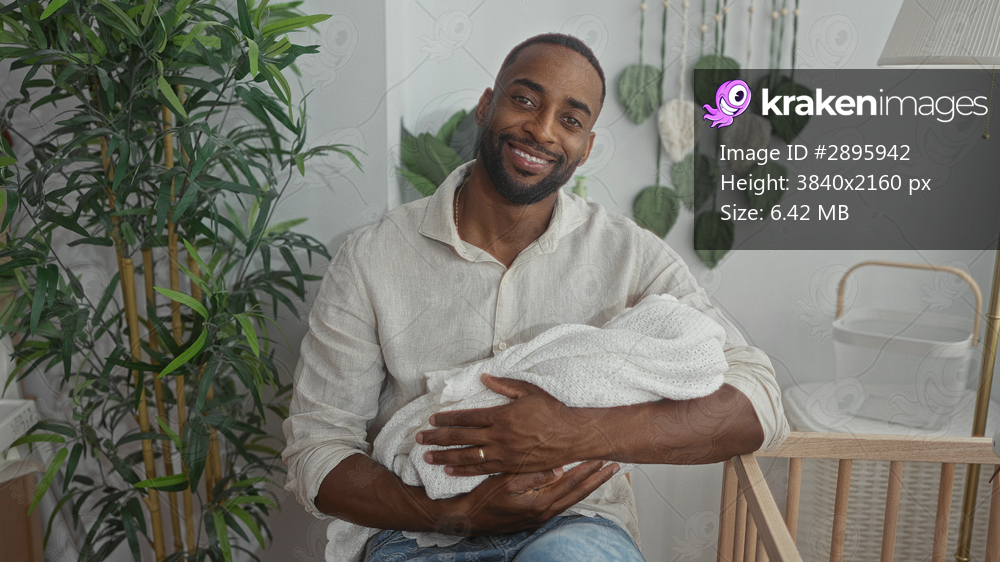 Young african american man gently cradling newborn baby with bare hands in bright nursery room beside wooden crib; fatherhood bonding serenity.