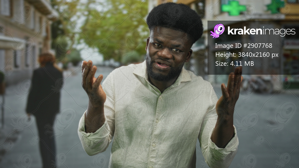 Young african american man gesturing with hands open and palms visible on street wearing light linen shirt; frustration debate.