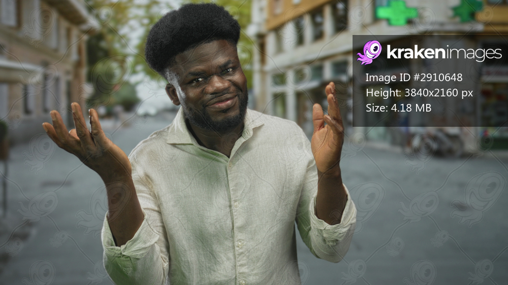Young african american man gesturing with hands open and palms visible on street wearing light linen shirt; frustration debate.