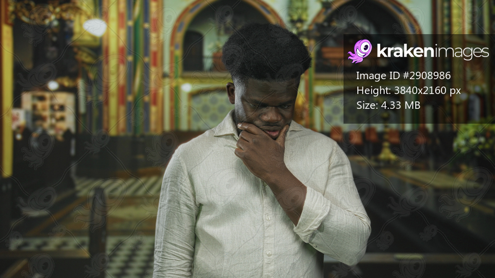 Young african american man hand on chin pensive pose inside ornate catholic church nave wearing light linen shirt and looking downward; quiet contemplation. - Kraken Images