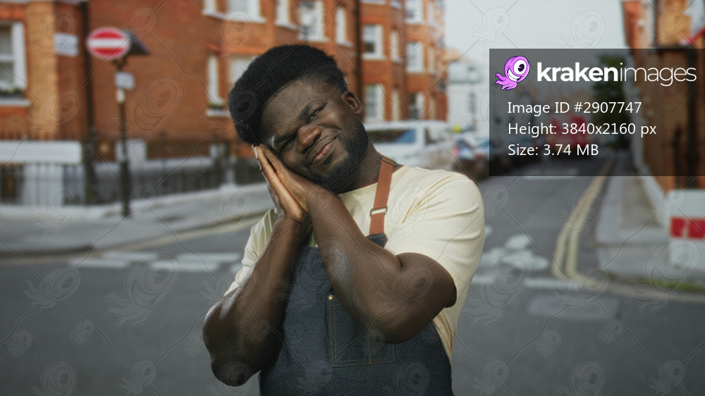 Young african american man with hands together at cheek for sleep on city street wearing apron; serenity rest contentment.