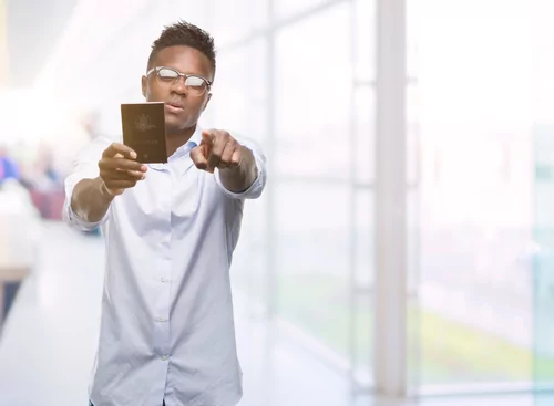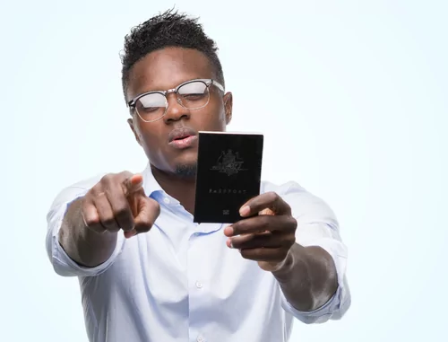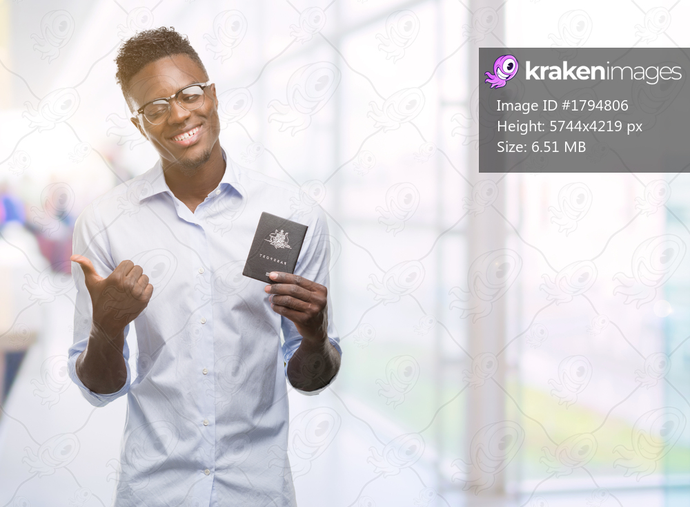 Young african american man holding australian passport pointing with hand and finger up with happy face smiling