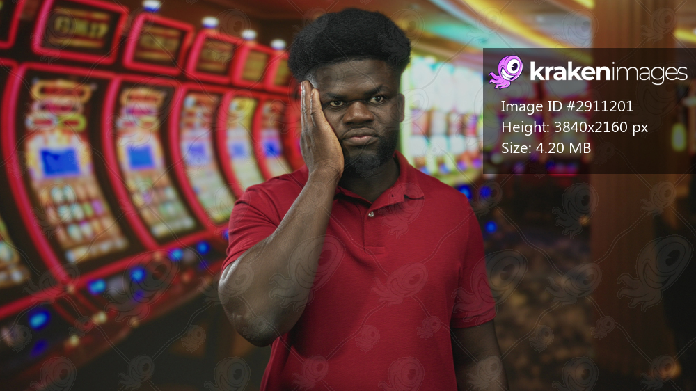 Young african american man holding cheek beside a row of illuminated slot machines inside a casino building; gambling frustration.