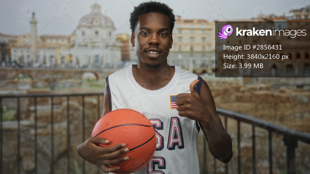 Young african american man holds bright orange basketball and gives thumbs up near building ruins under cloudy sky; confidence.