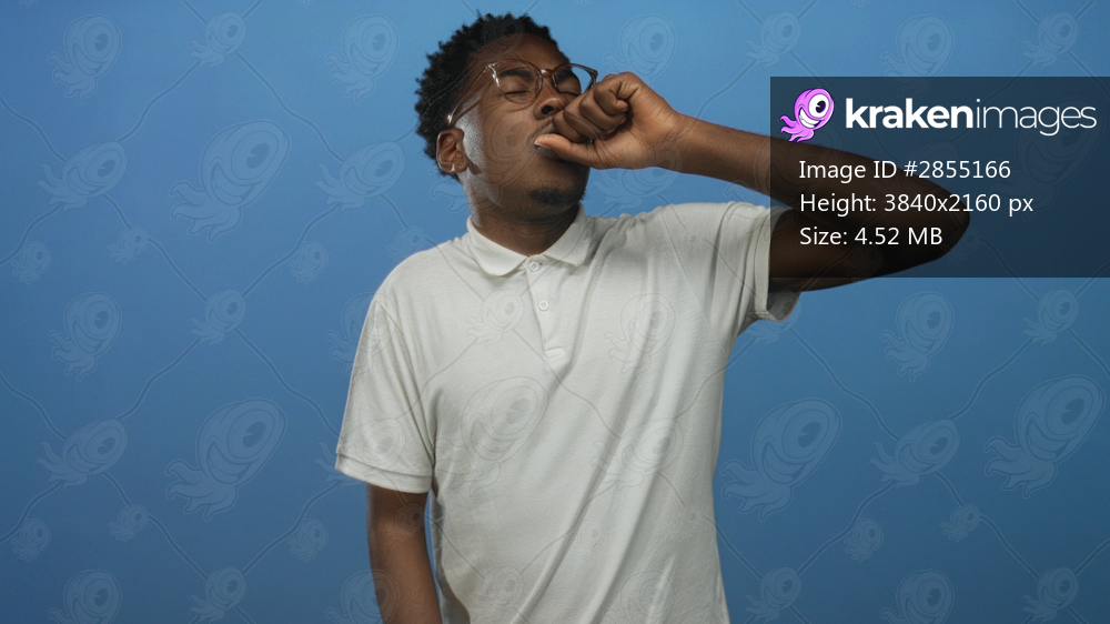 Young african american man holds hand to mouth while yawning in blue studio portrait setting; tiredness.