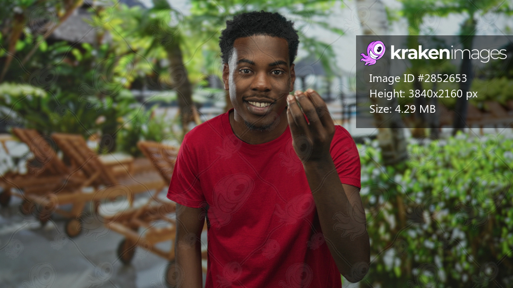 Young african american man in a red shirt beckons with a hand in a forest clearing; welcoming invitation.