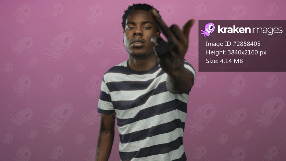 Young african american man in a striped shirt flipping middle finger in a pink studio; defiance rebellion.