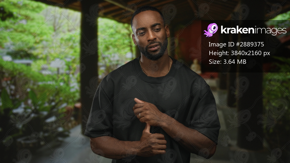 Young african american man in black shirt rubbing fingers while checking wedding ring in hotel building; introspection reflection uncertainty.