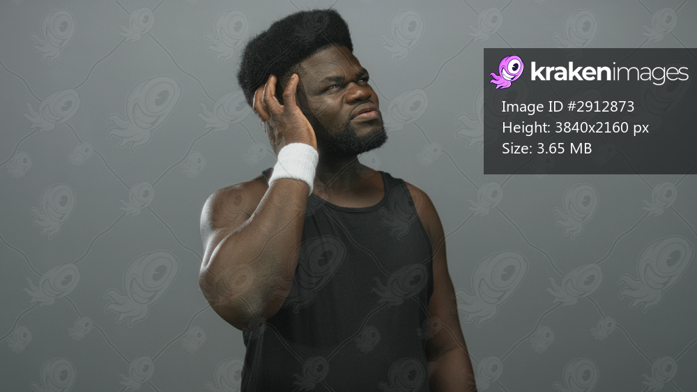 Young african american man in black tank top with white wristband holding hand to ear in studio, showing bare forearm muscles and athletic stance; quiet contemplation. - Kraken Images