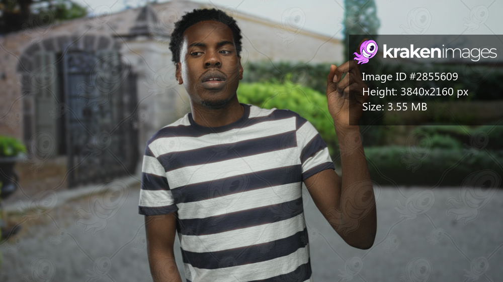 Young african american man in navy and white striped shirt points finger at ornate metal gate of stone building entrance under natural light; curiosity. - Kraken Images