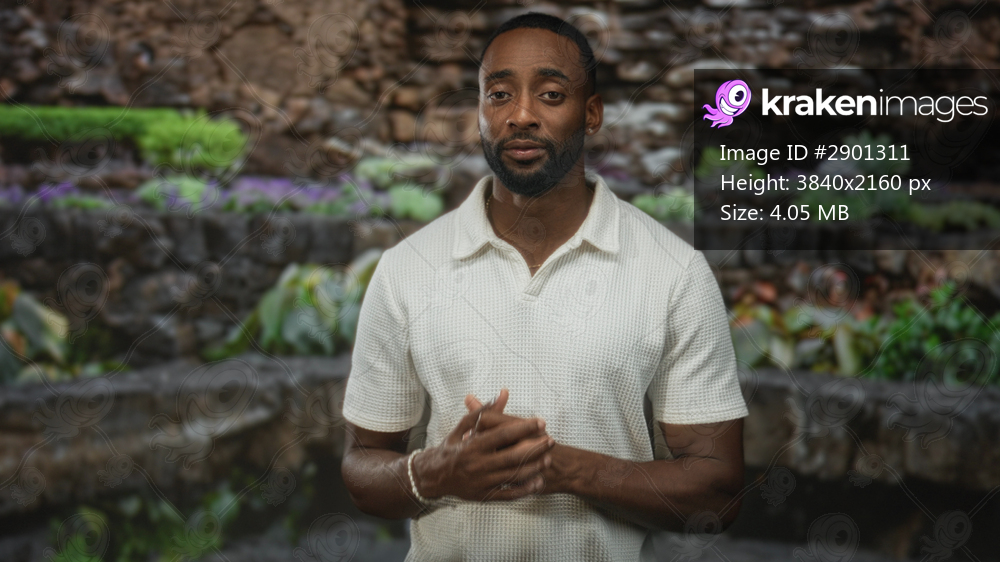 Young african american man in park wearing white polo with hands clasped and relaxed posture facing camera; calm reflection.