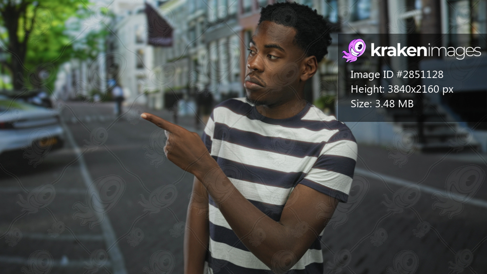 Young african american man in striped shirt pointing finger on bustling city street beside parked car; curiosity.