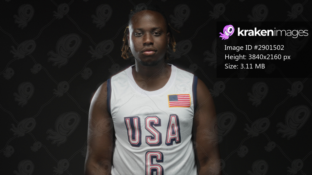 Young african american man in usa basketball jersey waving hand in black studio with direct gaze; quiet confidence.