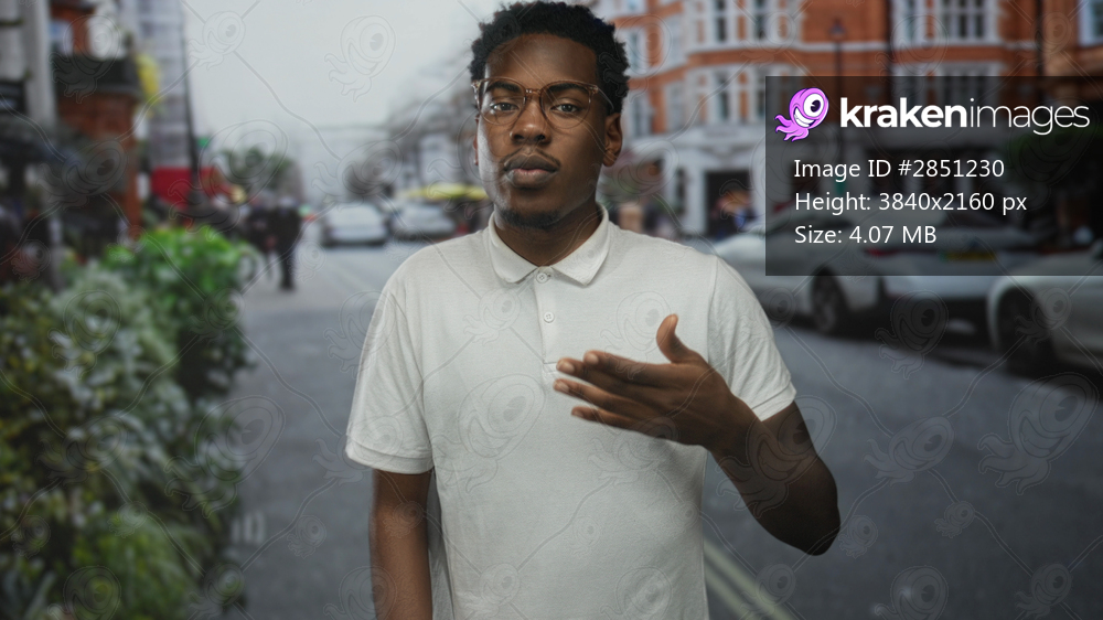 Young african american man in white polo shirt gestures ok sign with hand in busy city street; approval.
