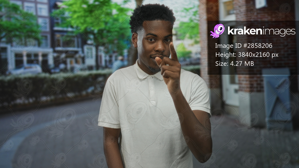 Young african american man in white polo shirt pointing finger to eye on street next to brick building; vigilance alertness caution observation.