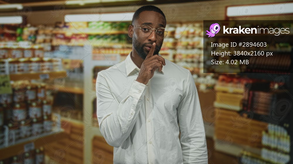 Young african american man in white shirt with finger to lips for silence in grocery store aisle; secret caution silence.