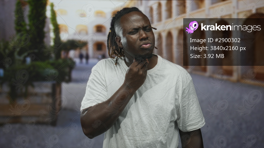 Young african american man in white t shirt holding neck with hand on old town street suffering sore throat; pain struggle.