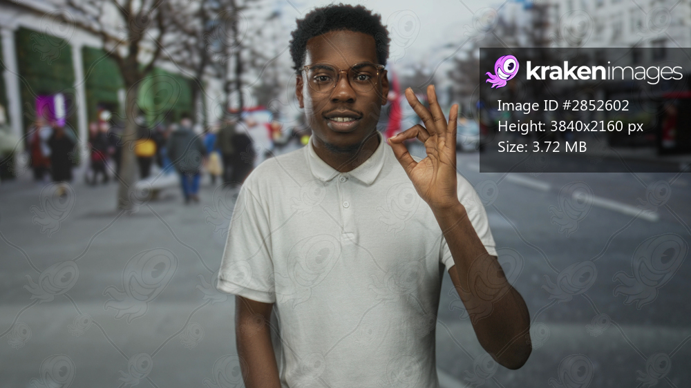 Young african american man in white t shirt shows ok gesture with hand on busy city street; approval.