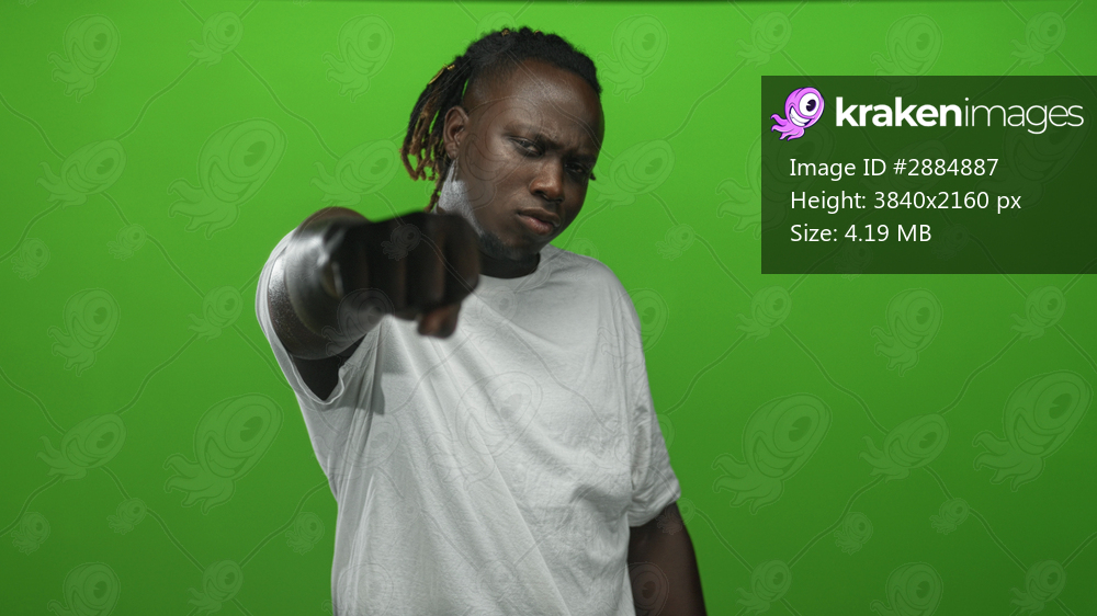 Young african american man in white tshirt pointing fist toward camera in green studio; defiance strength focus.
