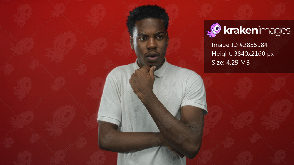 Young african american man in white tshirt touches chin in studio; thinking reflection doubt pondering.