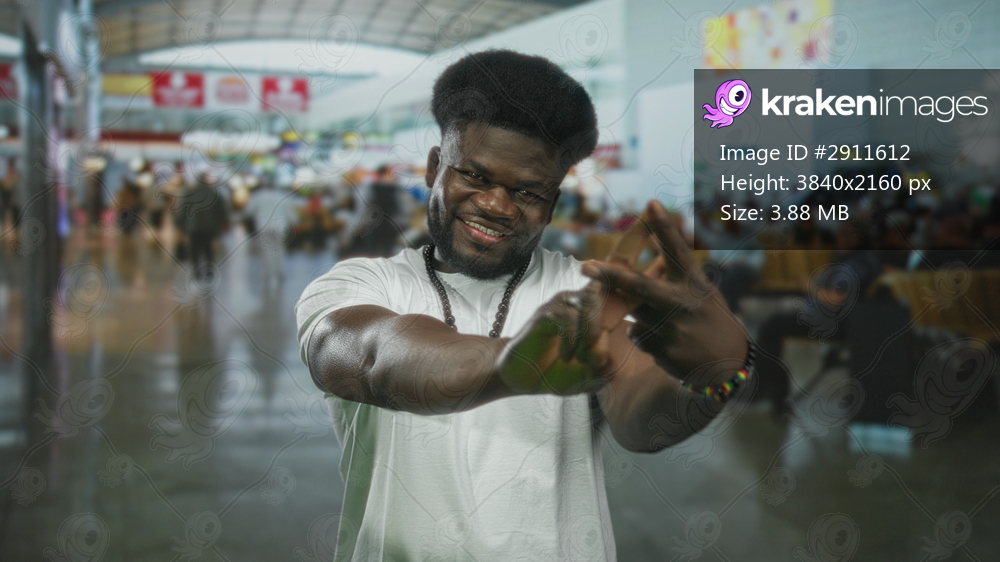 Young african american man making a finger triangle gesture while smiling in a busy airport terminal with blurred passengers and seating; playful confidence. - Kraken Images