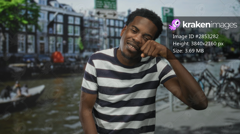 Young african american man mimics crying by wiping his eye in a busy urban street beside a canal during daytime; sadness.