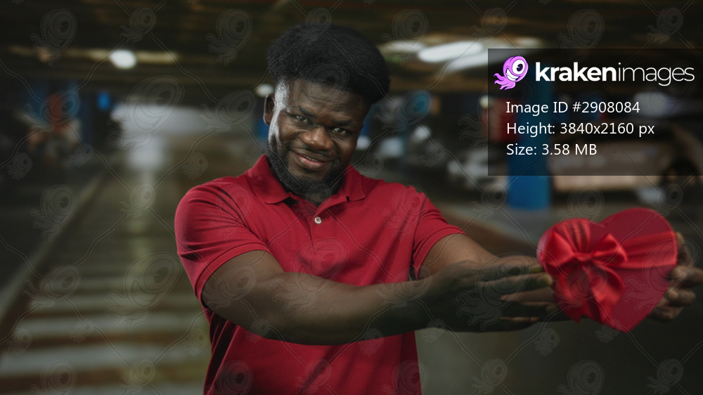 Young african american man offers a red heart gift box toward camera in a building parking garage; gentle romance.