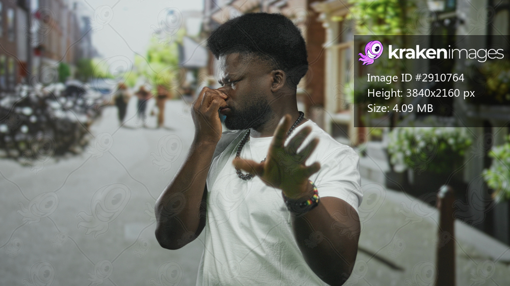 Young african american man pinches nose with one hand and raises index finger while standing on a busy city street lined with bikes and flower planters; disgust. - Kraken Images