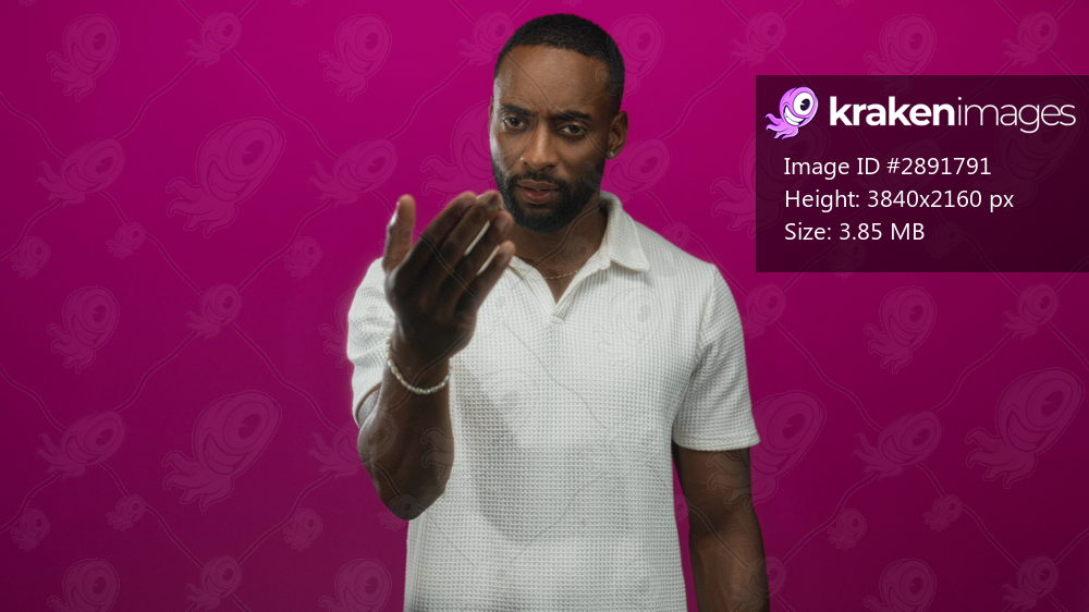 Young african american man pointing finger at camera, visible hand and finger, wearing white polo in magenta studio setting; challenge.