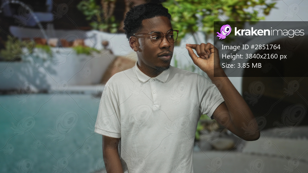 Young african american man pointing finger at sunlit hotel pool outdoors by resort building; serenity.