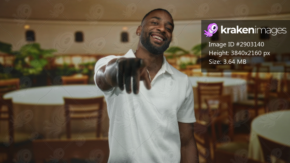 Young african american man pointing finger to camera in restaurant building wearing white polo and braces, smiling broadly and leaning forward; friendly greeting. - Kraken Images