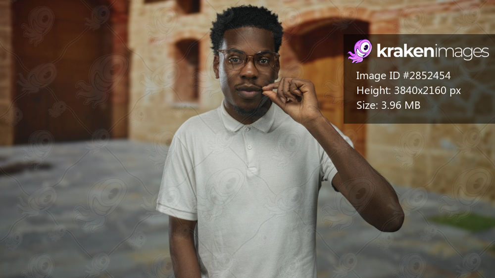 Young african american man pointing finger to lips for silence outside historic stone building on old town street; silence.