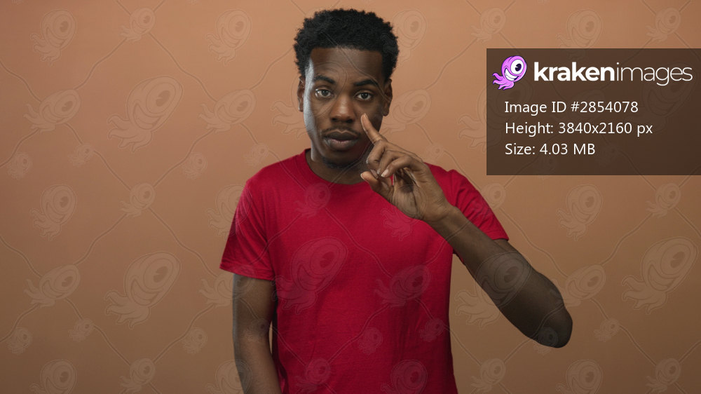Young african american man pointing finger upward against peach background in studio setting; focus clarity determination.