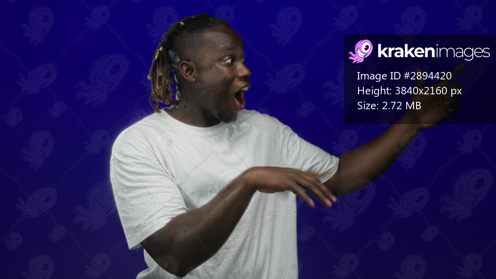 Young african american man pointing hand wearing white t shirt in royal blue studio; surprise playful energy.