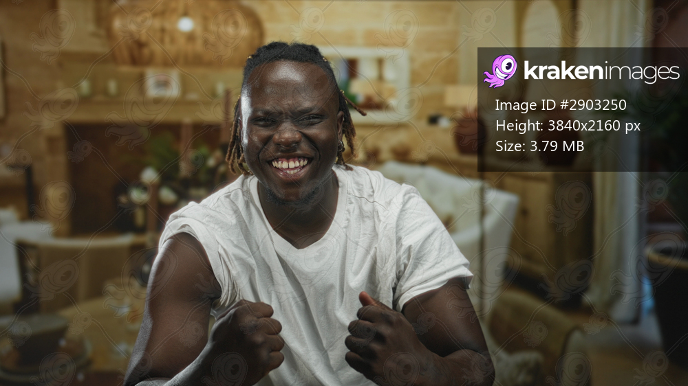 Young african american man points finger to bicep and flexes in a living room building; confidence celebration pride.