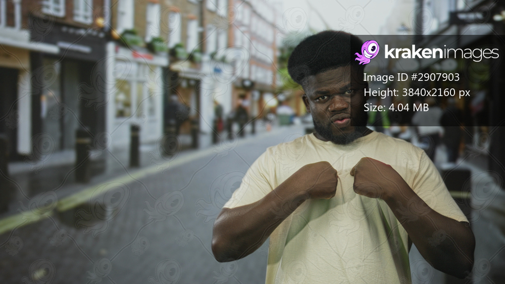 Young african american man points finger to chest on busy city street wearing beige t shirt with focused expression; confidence.