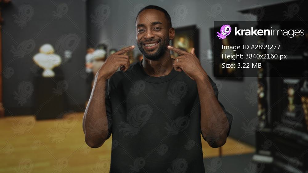 Young african american man points finger to smile in art gallery indoors with framed paintings and sculptures in view; pride confidence.