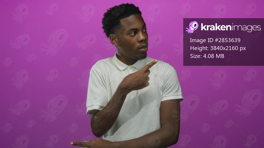 Young african american man points finger wearing white polo shirt in purple studio; uncertainty choice decision.