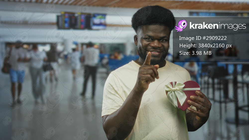 Young african american man points finger while holding a heart shaped gift box in a busy airport terminal near seating and checkin area; playful affection. - Kraken Images