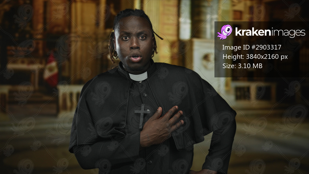 Young african american man priest with hand on chest inside ornate catholic church building; faith reverence prayer.