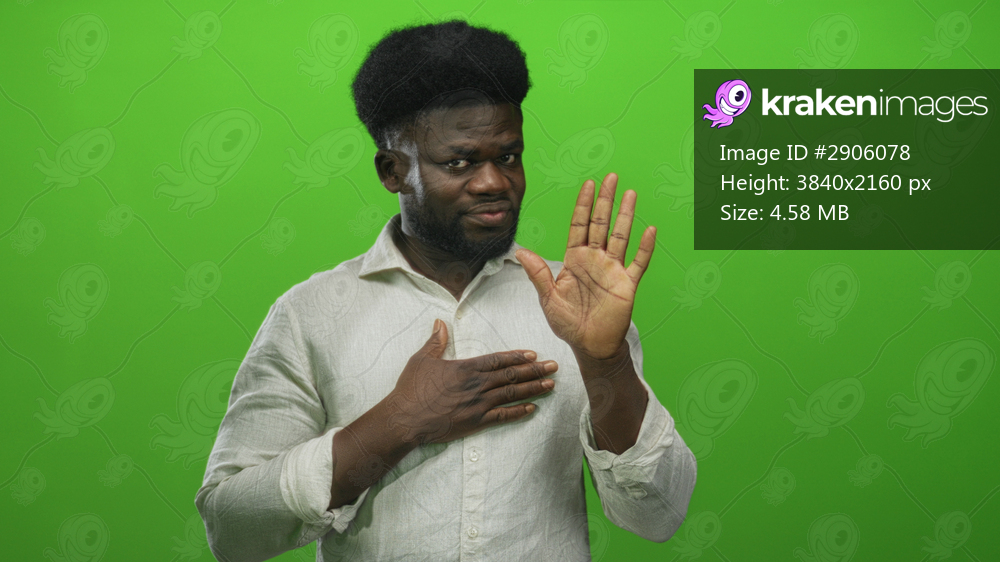 Young african american man with raised hand showing palm and other hand over chest in studio green screen set; sincerity pledge.