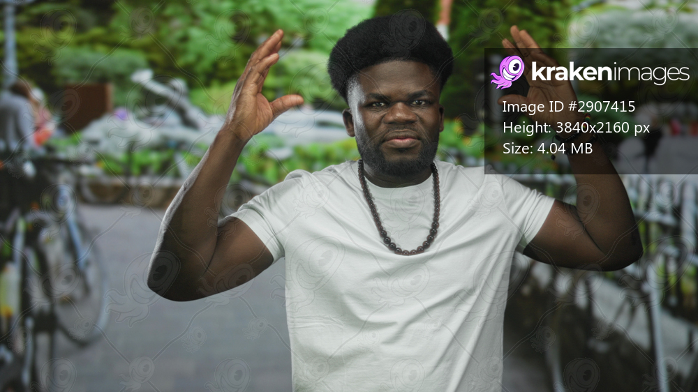 Young african american man raises hands near head with tense expression on city street beside parked bicycles and iron fence; urban frustration disbelief. - Kraken Images