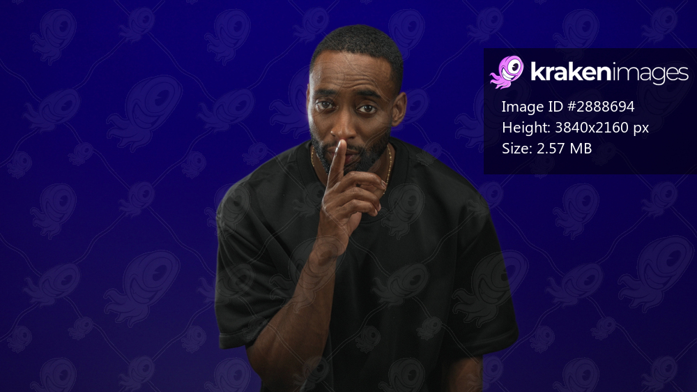 Young african american man with short beard and black shirt, finger to lips for silence in studio against deep blue backdrop; quiet secrecy.