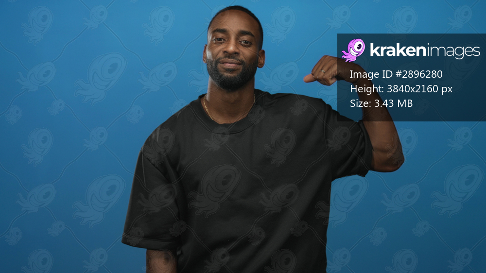 Young african american man with short beard wearing black shirt flexes bicep and smiles in blue studio; confidence strength.