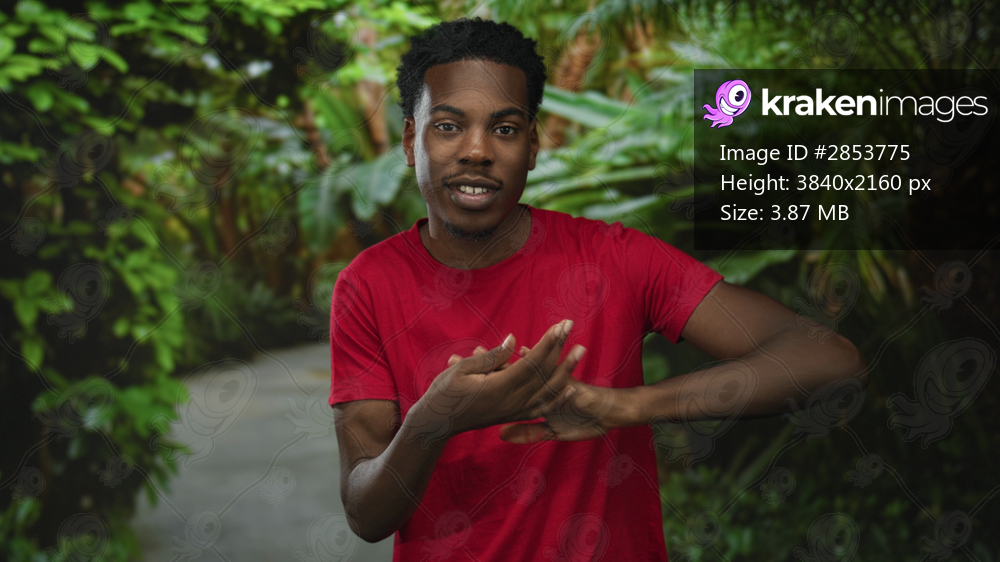 Young african american man smiles and makes money gesture with hand in sunlit green forest; generosity.