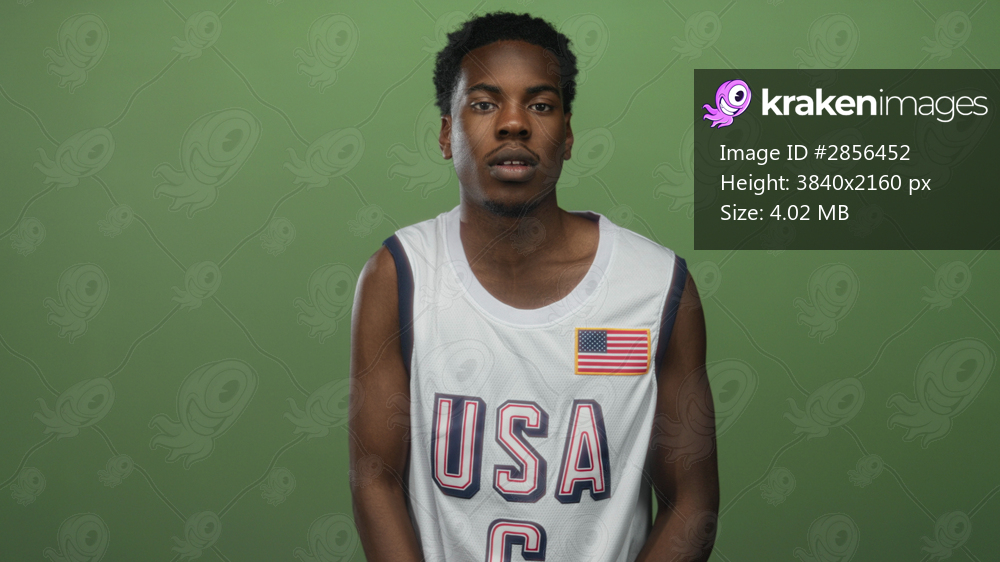 Young african american man smiling extends hand wearing usa jersey in green studio; welcome trust unity.
